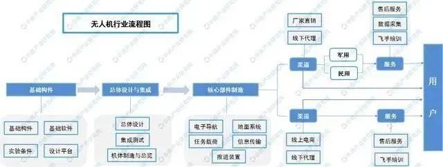 無(wú)人機(jī)行業(yè)產(chǎn)業(yè)鏈大致可分為研發(fā)、生產(chǎn)、銷(xiāo)售、服務(wù)等細(xì)分領(lǐng)域,具體可分為產(chǎn)品研發(fā)試驗(yàn)、飛控系統(tǒng)開(kāi)發(fā)、發(fā)動(dòng)機(jī)等關(guān)鍵零部件生產(chǎn)、載荷制造、無(wú)人機(jī)整機(jī)組裝、無(wú)人機(jī)銷(xiāo)售、無(wú)人機(jī)作業(yè)培訓(xùn)、運(yùn)營(yíng)服務(wù)業(yè)務(wù)、一體化應(yīng)用服務(wù)環(huán)節(jié)。